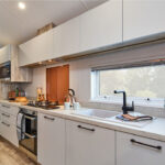 - The Kitchen: At the heart of the unique layout is the practical linear kitchen. It features modern appliances, a stylish composite effect sink, and an eye-catching orange colour scheme. With a practical design, it’s a joy for anyone who loves to cook.