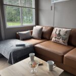 - Spacious Lounge: Huge L-shaped sofa, room for a 50″ TV, and a log-effect fire.